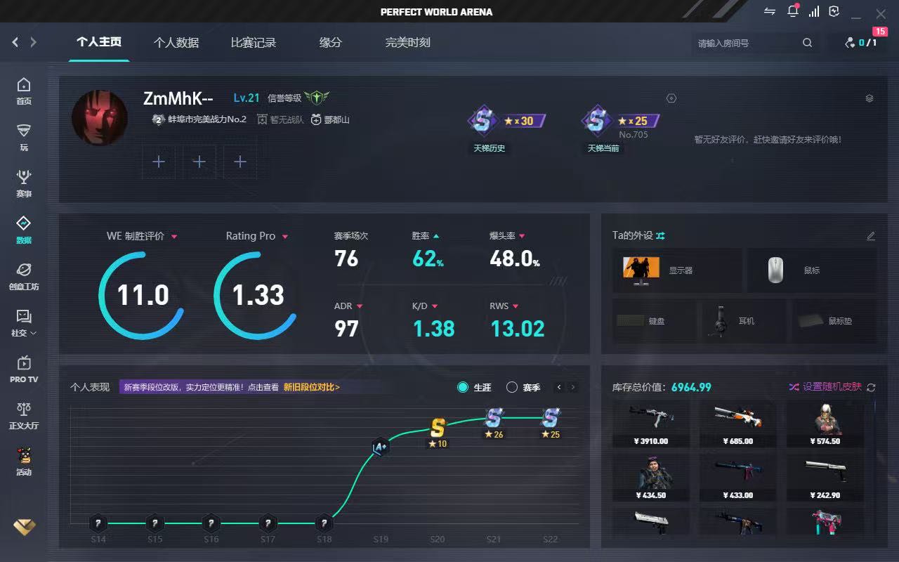 CS多赛季老玩家,全平台各个段位有号,心态好,技术不错